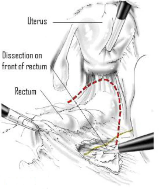 Start van de ventrale rectopexie. Vooreerst ecartement van de baarmoeder en nadien dissectie aan de voorzijde van de endeldarm, volgens de gestippelde lijn, vervolgens tussen de vagina en de endeldarm (rectovaginale septum).