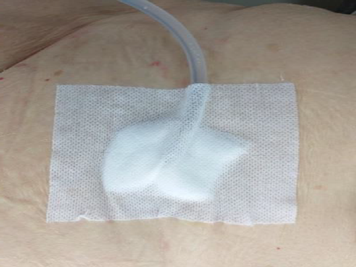 Le site d'insertion, dans le bas-ventre, doit être nettoyé trois fois par semaine avec un désinfectant salin/alcool. Un pansement sec est idéal (photo 3). Il est conseillé de fixer la sonde à un endroit différent à chaque fois afin d'éviter la formation d'escarres ou de protubérances au niveau du site d'insertion. Ainsi, si la sonde est fixée du côté gauche de votre abdomen une semaine, elle sera fixée du côté droit la semaine suivante.