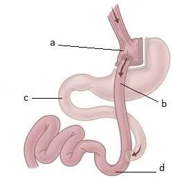 Au cours de cette intervention, un petit estomac (20 cc) est créé à la jonction entre l'œsophage et l'estomac, qui est détaché du reste de l'estomac (Figure 2). Ensuite, l'intestin grêle est sectionné à environ 30 cm derrière la sortie de l'estomac et la partie inférieure est reliée au pré-estomac (boucle alimentaire). Après environ 120 cm, cet intestin grêle est reconnecté à la sortie de l'estomac (boucle digestive).