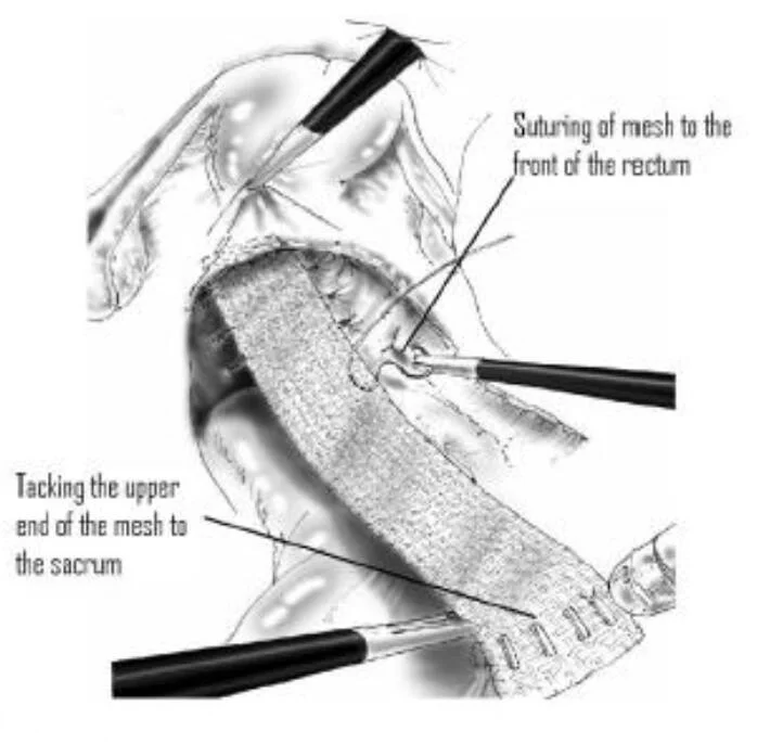 L'un des principaux avantages de cette technique est qu'elle est pratiquée à l'avant du rectum et n'a donc aucun impact sur l'innervation de l'intestin et des organes génitaux situés derrière le rectum. Au cours de l'intervention, l'avant du rectum est détaché du vagin (chez la femme) ou de la vessie et de la prostate (chez l'homme). Un espace est également créé pour fixer la prothèse à l'avant du rectum. Une extrémité est fixée profondément dans le rectum, tandis que l'autre est fixée au sacrum ou au bas du dos.