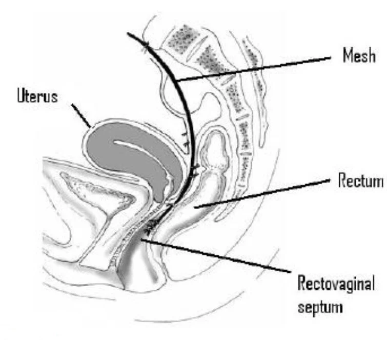 Chez la femme, le dôme vaginal est suturé à la prothèse pour traiter ou prévenir un prolapsus vaginal existant. Cette intervention permet de retirer l'intestin du bassin, de restaurer son anatomie normale et de prévenir les récidives.